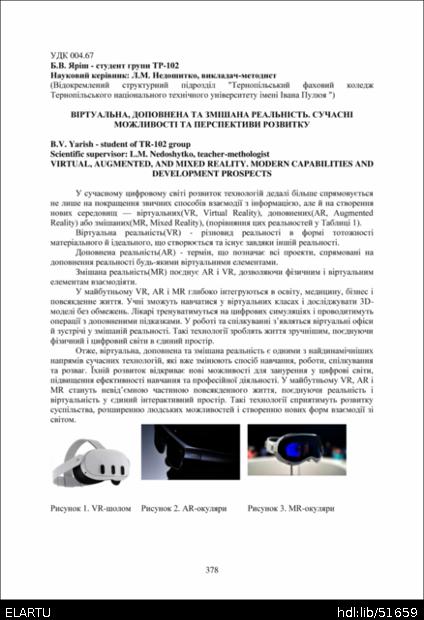 | Bibliographic citation (CHICAGO): | Yarish B. V. (2025) Virtualna, dopovnena ta zmishana realnist. Suchasni mozhlyvosti ta perspektyvy rozvytku [Virtual, augmented, and mixed reality. Modern capabilities and development prospects]. Proceedings of the ⅩⅣ International Scientific and Technical Conference of Young Scientists and Students “Current Issues of Modern Technologies” (Tern., 11-12 December 2025), pp. 378-379 [in Ukrainian]. |