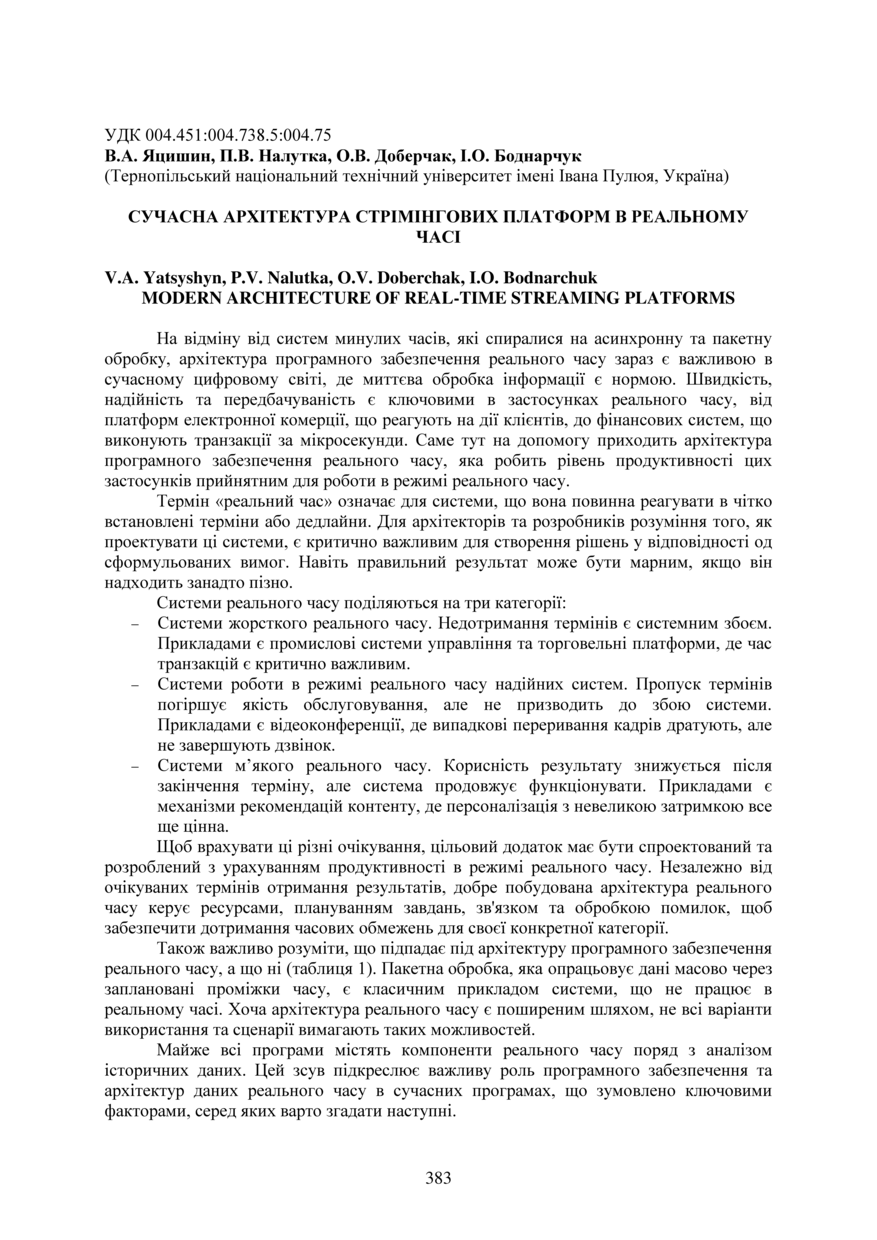 | Bibliographic citation (CHICAGO): | Yatsyshyn V. A., Nalutka P. V., Doberchak O. V., Bodnarchuk I. O. (2025) Suchasna arkhitektura striminhovykh platform v realnomu chasi [Modern architecture of real-time streaming platforms]. Proceedings of the ⅩⅣ International Scientific and Technical Conference of Young Scientists and Students “Current Issues of Modern Technologies” (Tern., 11-12 December 2025), pp. 383-387 [in Ukrainian]. |