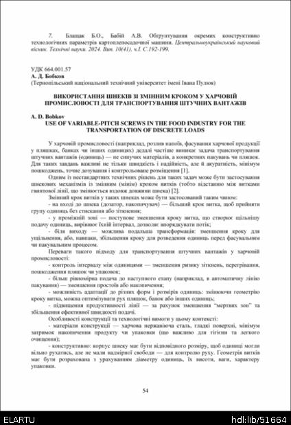 | Bibliographic citation (CHICAGO): | Bobkov A. D. (2025) Vykorystannia shnekiv zi zminnym krokom u kharchovii promyslovosti dlia transportuvannia shtuchnykh vantazhiv [Use of variable-pitch screws in the food industry for the transportation of discrete loads]. Proceedings of the ⅩⅣ International Scientific and Technical Conference of Young Scientists and Students “Current Issues of Modern Technologies” (Tern., 11-12 December 2025), pp. 54-55 [in Ukrainian]. |