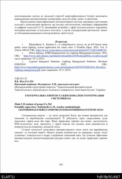 | Bibliographic citation (APA): | Zhuk, V. B. (2025). Heotermalna enerhiia ta vdoskonaleni heotermalni systemy(EGS) [Geothermal energy and enhanced geothermal systems (EGS)]. Proceedings of the ⅩⅣ International Scientific and Technical Conference of Young Scientists and Students “Current Issues of Modern Technologies”, 11-12 December 2025, Ternopil, 393-395. PE Palianytsia V.A.. [in Ukrainian]. |