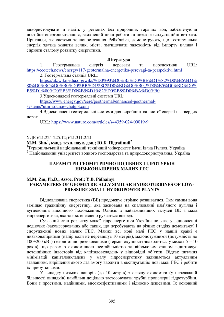 | Bibliographic citation (APA): | Zin, M. M., & Pidhainyi, Y. B. (2025). Parametry heometrychno podibnykh hidroturbin nyzkonapirnykh malykh HES [Parameters of geometrically similar hydroturbines of low-pressure small hydropower plants]. Proceedings of the ⅩⅣ International Scientific and Technical Conference of Young Scientists and Students “Current Issues of Modern Technologies”, 11-12 December 2025, Ternopil, 395-397. PE Palianytsia V.A.. [in Ukrainian]. |