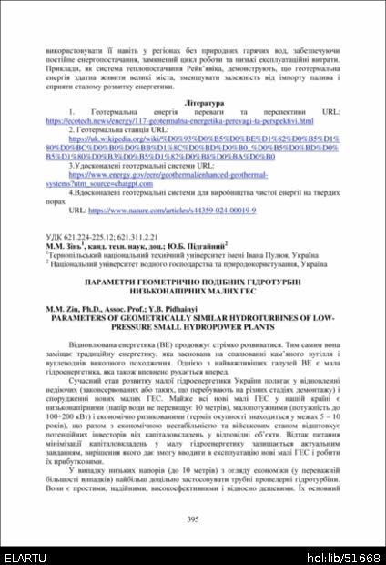 | Bibliographic reference (2015): | Зінь М. М., Підгайний Ю. Б. Параметри геометрично подібних гідротурбін низьконапірних малих ГЕС // Матеріали ⅩⅣ МНТКМУС „Актуальні задачі сучасних технологій“, Тернопіль, 11-12 грудня 2025. 2025. С. 395–397. |