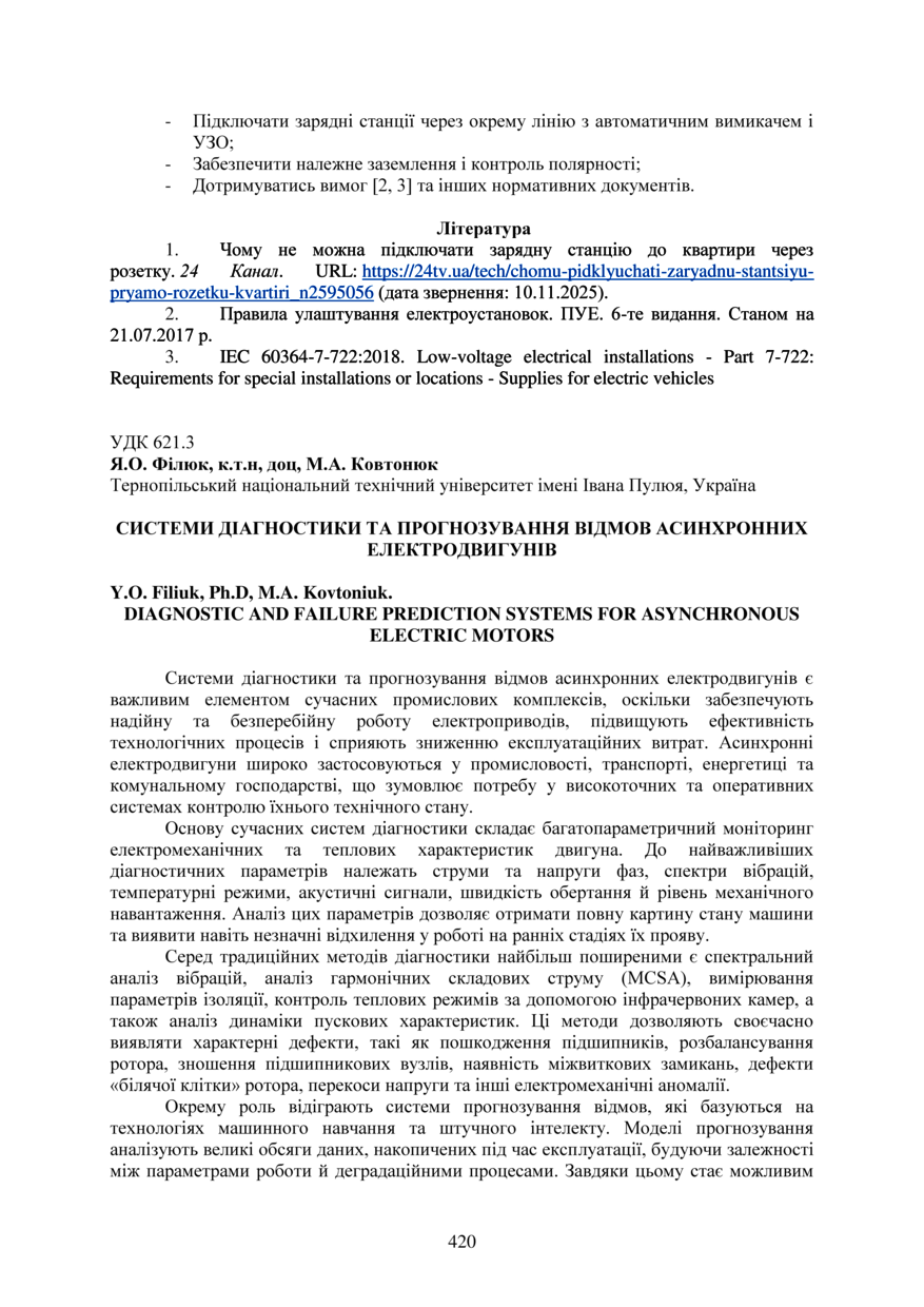 | Bibliographic description (Ukraine): | Філюк Я. О. Системи діагностики та прогнозування відмов асинхронних електродвигунів / Ярослав Олександрович Філюк, М. А. Ковтонюк // Матеріали ⅩⅣ МНТКМУС „Актуальні задачі сучасних технологій“, 11-12 грудня 2025. — Т. : ФОП Паляниця В.А., 2025. — С. 420–421. — (Електротехніка та енергозбереження). |