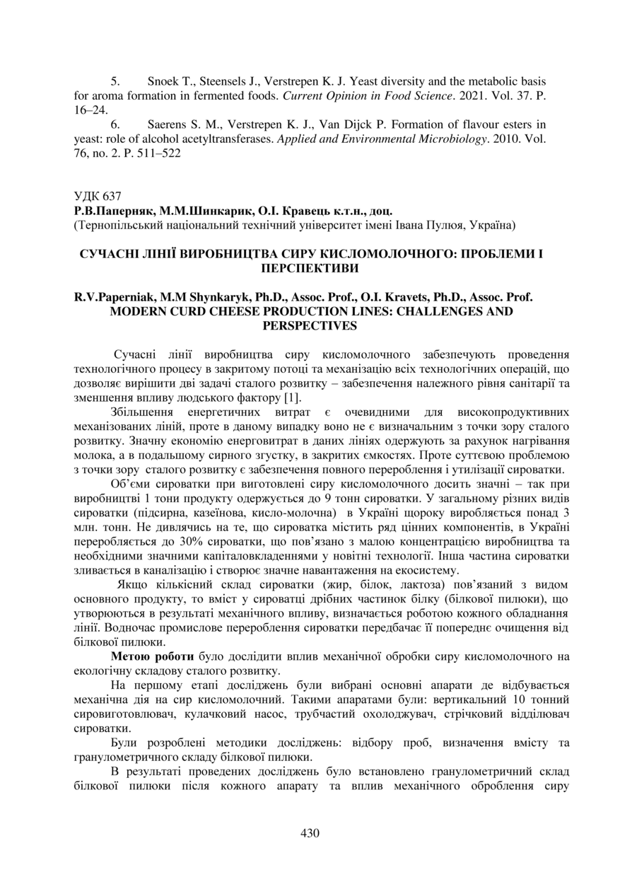 References: 1. Paperniak R.V. Kompleksnyi pidkhid do otsinky mashynno-aparaturnoho zabezpechennia vyrobnytstva syru kyslomolochnoho/ R.V. Paperniak, M.M. Shynkaryk, O.I. Kravets, B.Ya. Lukiianchuk, Tavriiskyi naukovyi visnyk. Tekhnichni nauky. №.5, 2024. P. 214-224
