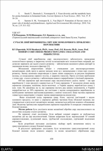 Бібліографічне посилання: Паперняк Р. В., Шинкарик М. М., Кравець О. І. Сучасні лінії виробництва сиру кисломолочного: проблеми і перспективи // Матеріали ⅩⅣ МНТКМУС „Актуальні задачі сучасних технологій“, Тернопіль, 11-12 грудня 2025. 2025. С. 430–431.