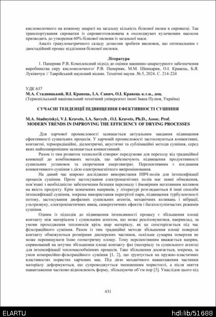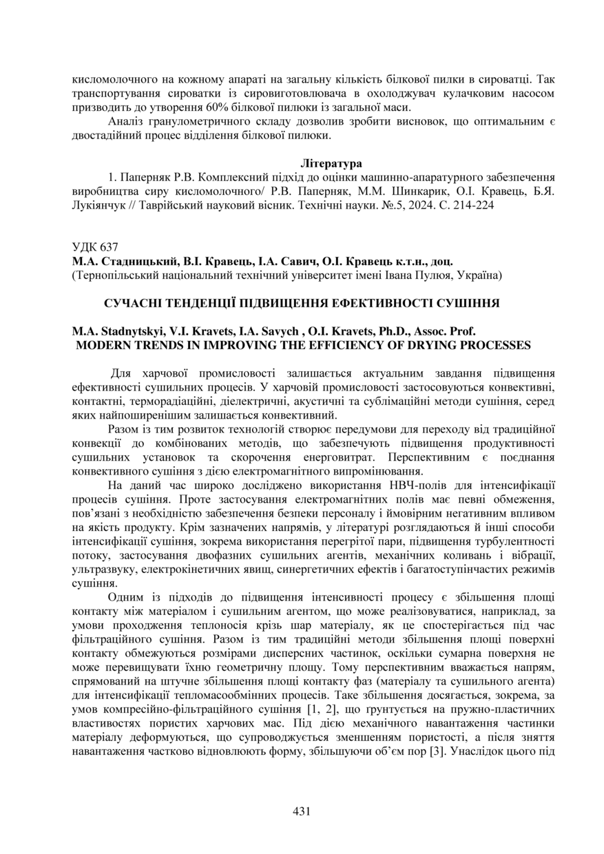 | Bibliographic citation (APA): | Stadnytskyi, M. A., Kravets, V. I., Savych, I. A., & Kravets, O. I. (2025). Suchasni tendentsii pidvyshchennia efektyvnosti sushinnia [Modern trends in improving the efficiency of drying processes]. Proceedings of the ⅩⅣ International Scientific and Technical Conference of Young Scientists and Students “Current Issues of Modern Technologies”, 11-12 December 2025, Ternopil, 431-432. PE Palianytsia V.A.. [in Ukrainian]. |