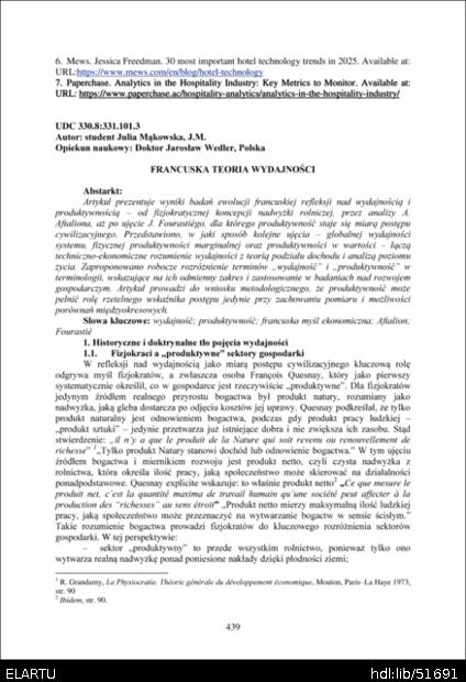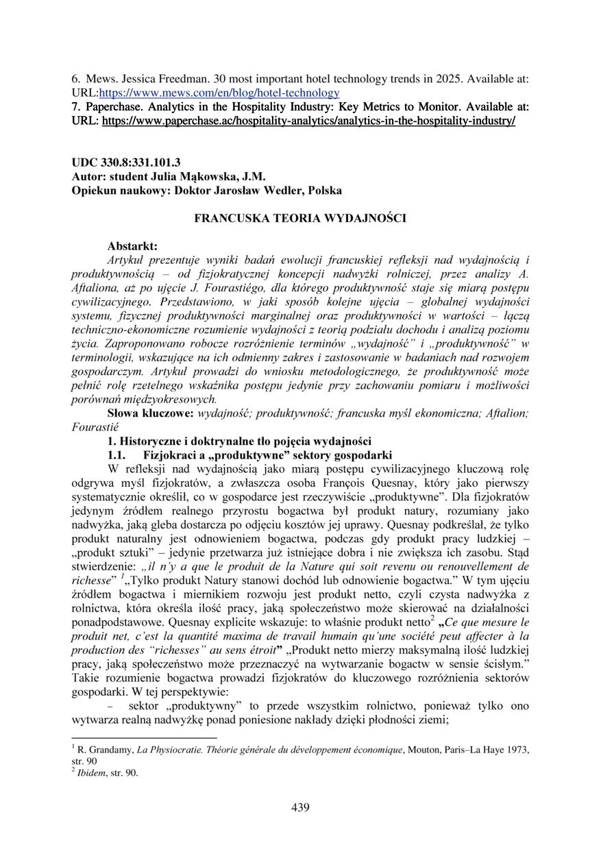 Bibliographic description (Ukraine): Mąkowska J. Francuska teoria wydajności / Julia Mąkowska // Матеріали ⅩⅣ МНТКМУС „Актуальні задачі сучасних технологій“, 11-12 грудня 2025. — Т. : ФОП Паляниця В.А., 2025. — С. 439–449. — (Економічні та соціальні аспекти нових технологій).