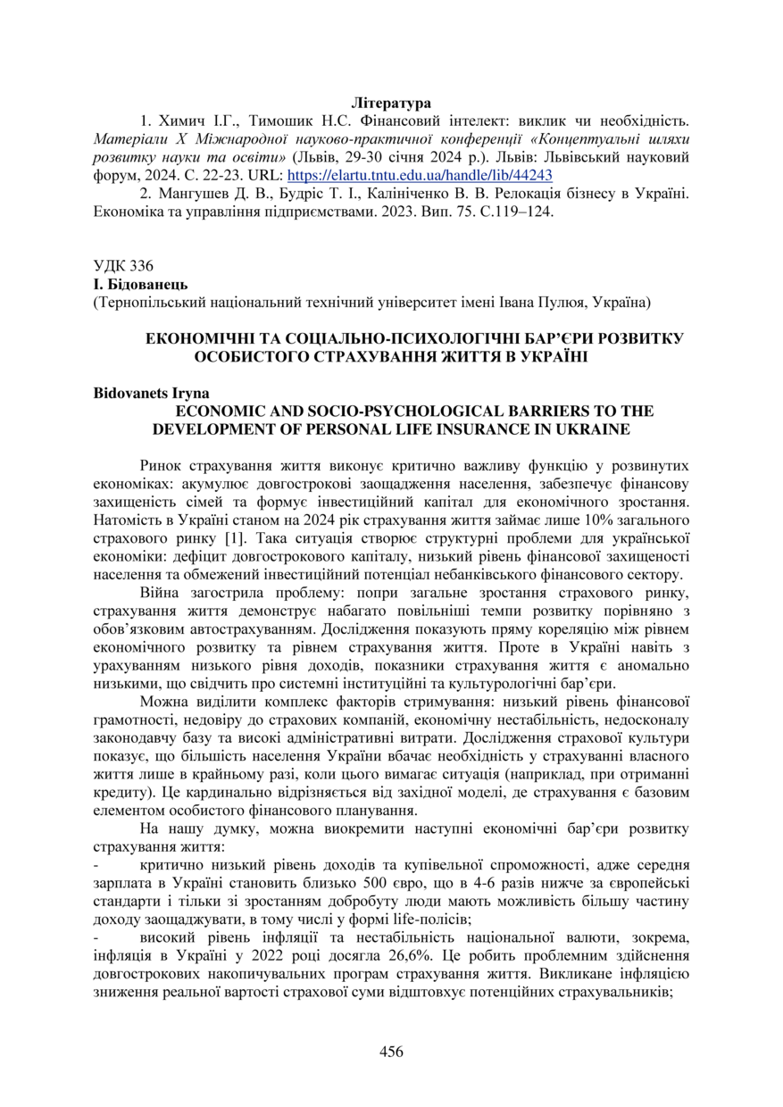 Bibliographic citation (APA): Bidovanets, I. (2025). Ekonomichni ta sotsialno-psykholohichni bariery rozvytku osobystoho strakhuvannia zhyttia v Ukraini [Economic and socio-psychological barriers to the development of personal life insurance in Ukraine]. Proceedings of the ⅩⅣ International Scientific and Technical Conference of Young Scientists and Students “Current Issues of Modern Technologies”, 11-12 December 2025, Ternopil, 456-458. PE Palianytsia V.A.. [in Ukrainian].