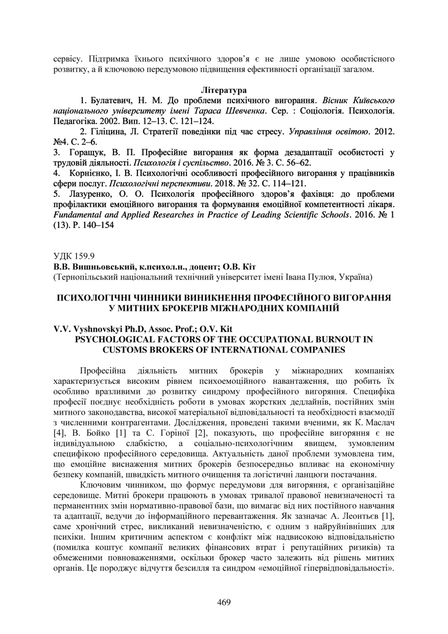 | Bibliographic citation (APA): | Vyshnovskyi, V. V., & Kit, O. V. (2025). Psykholohichni chynnyky vynyknennia profesiinoho vyhorannia u mytnykh brokeriv mizhnarodnykh kompanii [Psychological factors of the occupational burnout in customs brokers of international companies]. Proceedings of the ⅩⅣ International Scientific and Technical Conference of Young Scientists and Students “Current Issues of Modern Technologies”, 11-12 December 2025, Ternopil, 469-471. PE Palianytsia V.A.. [in Ukrainian]. |