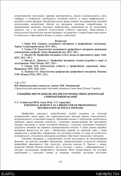 | Bibliographic reference (2015): | Вишньовський Я. В., Липницький В. В. Емоційне вигорання як предиктор професійної деформації співробітників поліції // Матеріали ⅩⅣ МНТКМУС „Актуальні задачі сучасних технологій“, Тернопіль, 11-12 грудня 2025. 2025. С. 471–473. |