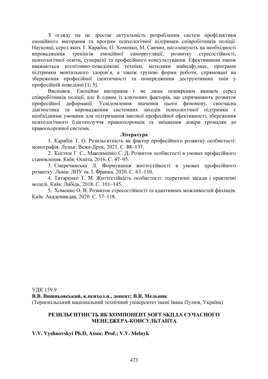 | Bibliographic reference (2015): | Вишньовський В. В., Мельник В. В. Резильєнтність як компонент soft skills сучасного менеджера-консультанта // Матеріали ⅩⅣ МНТКМУС „Актуальні задачі сучасних технологій“, Тернопіль, 11-12 грудня 2025. 2025. С. 473–475. |