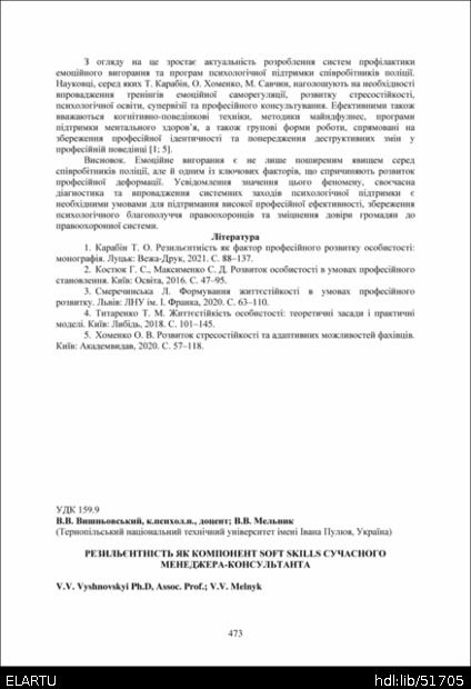 | Bibliographic citation (APA): | Vyshnovskyi, V. V., & Melnyk, V. V. (2025). Rezylientnist yak komponent soft skills suchasnoho menedzhera-konsultanta [Resilience as a component of soft skills of a modern manager-consultant]. Proceedings of the ⅩⅣ International Scientific and Technical Conference of Young Scientists and Students “Current Issues of Modern Technologies”, 11-12 December 2025, Ternopil, 473-475. PE Palianytsia V.A.. [in Ukrainian]. |