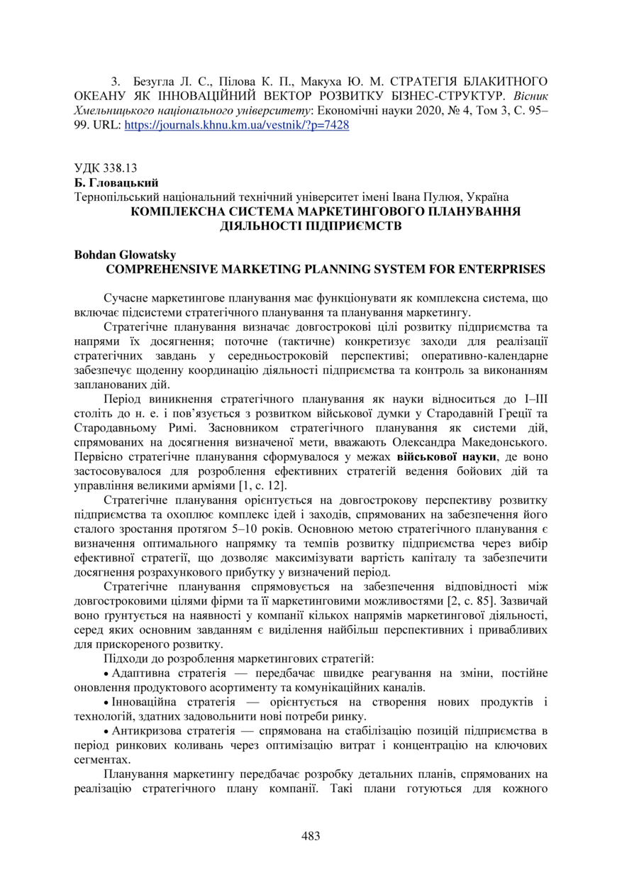 | Bibliographic reference (2015): | Гловацький Б. Комплексна система маркетингового планування діяльності підприємств // Матеріали ⅩⅣ МНТКМУС „Актуальні задачі сучасних технологій“, Тернопіль, 11-12 грудня 2025. 2025. С. 483–485. |