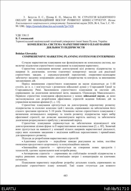 | Bibliographic citation (APA): | Glowatsky, B. (2025). Kompleksna systema marketynhovoho planuvannia diialnosti pidpryiemstv [Comprehensive marketing planning system for enterprises]. Proceedings of the ⅩⅣ International Scientific and Technical Conference of Young Scientists and Students “Current Issues of Modern Technologies”, 11-12 December 2025, Ternopil, 483-485. PE Palianytsia V.A.. [in Ukrainian]. |