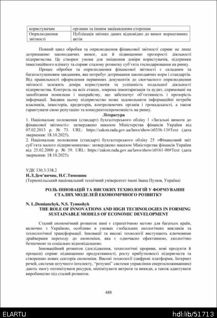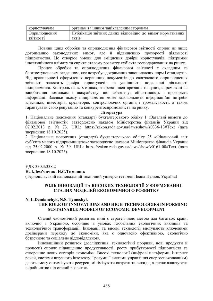 Bibliographic citation (CHICAGO): Demianchyk N. L., Tymoshyk N. S. (2025) Rol innovatsii ta vysokykh tekhnolohii u formuvanni stalykh modelei ekonomichnoho rozvytku [The role of innovations and high technologies in forming sustainable models of economic development]. Proceedings of the ⅩⅣ International Scientific and Technical Conference of Young Scientists and Students “Current Issues of Modern Technologies” (Tern., 11-12 December 2025), pp. 488-490 [in Ukrainian].