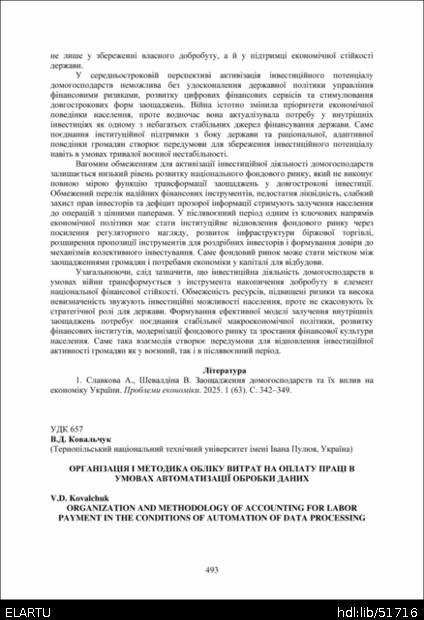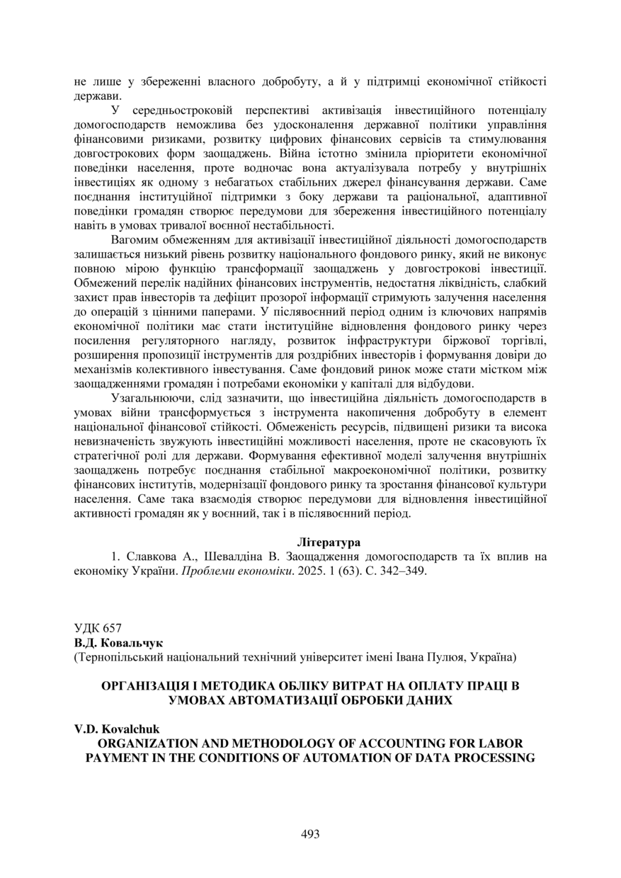 Bibliographic description (Ukraine): Ковальчук В. Д. Організація і методика обліку витрат на оплату праці в умовах автоматизації обробки даних / В. Д. Ковальчук // Матеріали ⅩⅣ МНТКМУС „Актуальні задачі сучасних технологій“, 11-12 грудня 2025. — Т. : ФОП Паляниця В.А., 2025. — С. 493–495. — (Економічні та соціальні аспекти нових технологій).
