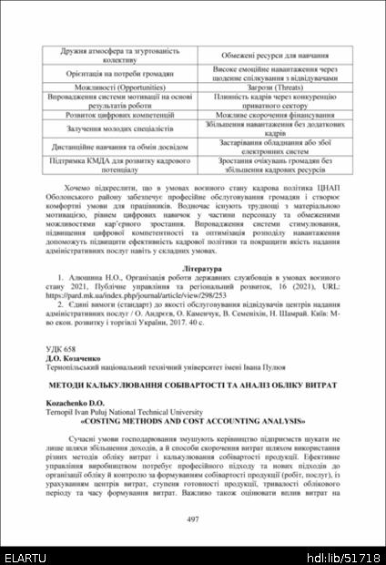 Bibliographic reference (2015): Козаченко Д. О. Методи калькулювання собівартості та аналіз обліку витрат // Матеріали ⅩⅣ МНТКМУС „Актуальні задачі сучасних технологій“, Тернопіль, 11-12 грудня 2025. 2025. С. 497–499.