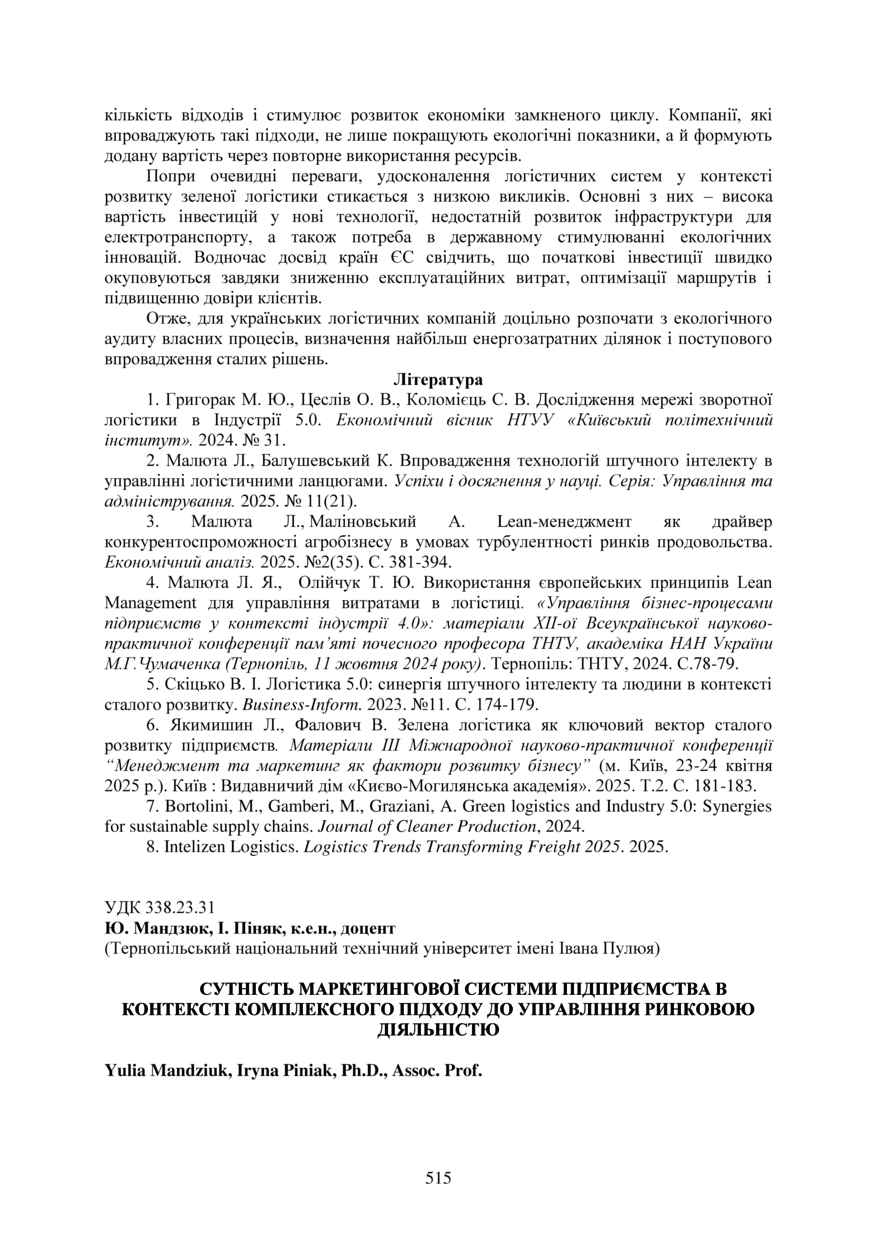 | Bibliographic citation (APA): | Mandziuk, Y., & Piniak, I. (2025). Sutnist marketynhovoi systemy pidpryiemstva v konteksti kompleksnoho pidkhodu do upravlinnia rynkovoiu diialnistiu [The essenceof the enterprise marketing system in the context of a comprehensive approach tomarket activity management]. Proceedings of the ⅩⅣ International Scientific and Technical Conference of Young Scientists and Students “Current Issues of Modern Technologies”, 11-12 December 2025, Ternopil, 515-517. PE Palianytsia V.A.. [in Ukrainian]. |