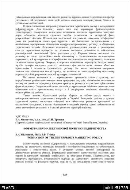| Bibliographic reference (2015): | Оксентюк Б. А., Трінька П. П. Формування маркетингової політики підприємства // Матеріали ⅩⅣ МНТКМУС „Актуальні задачі сучасних технологій“, Тернопіль, 11-12 грудня 2025. 2025. С. 528–530. |