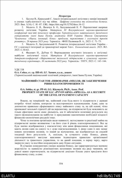 | Bibliographic citation (APA): | Sobko, O. A., & Khymych, I. G. (2025). Mainovyi stan TOV "Pyvovarnia "Opillia" yak zabezpechennia rivnia platospromozhnosti [Property state of LLC «Pyvovarnia «Opillia» as a security of the level of payment capacity]. Proceedings of the ⅩⅣ International Scientific and Technical Conference of Young Scientists and Students “Current Issues of Modern Technologies”, 11-12 December 2025, Ternopil, 554-556. PE Palianytsia V.A.. [in Ukrainian]. |