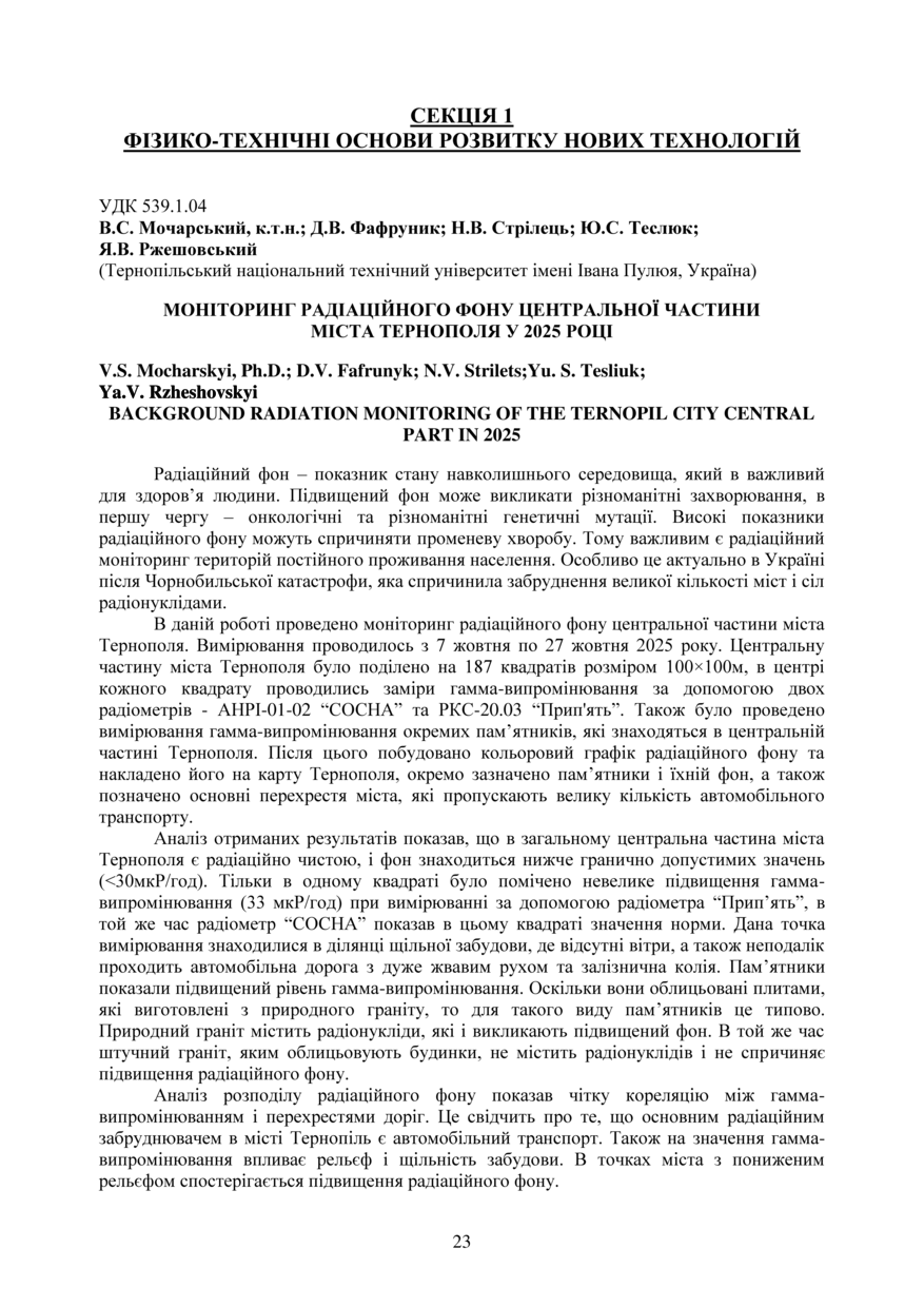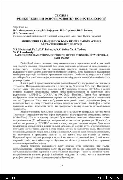 | Bibliographic citation (APA): | Mocharskyi, V. S., Fafrunyk, D. V., Strilets, N. V., Tesliuk, Yu. S., & Rzheshovskyi, Ya. V. (2025). Monitorynh radiatsiinoho fonu tsentralnoi chastyny mista Ternopolia u 2025 rotsi [Background radiation monitoring of the Ternopil city central part in 2025]. Proceedings of the ⅩⅣ International Scientific and Technical Conference of Young Scientists and Students “Current Issues of Modern Technologies”, 11-12 December 2025, Ternopil, 23. PE Palianytsia V.A.. [in Ukrainian]. |