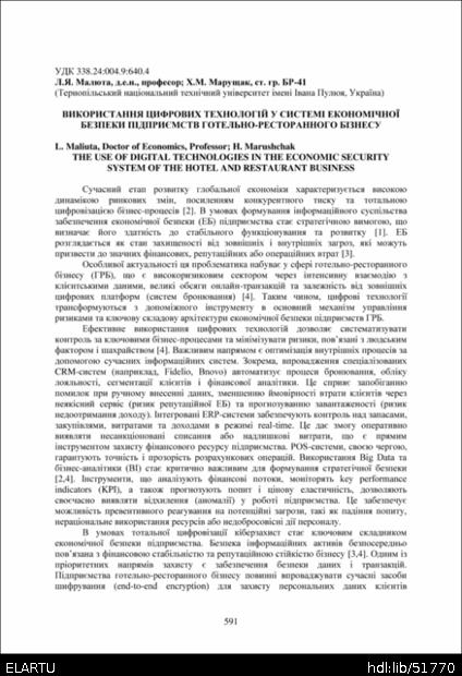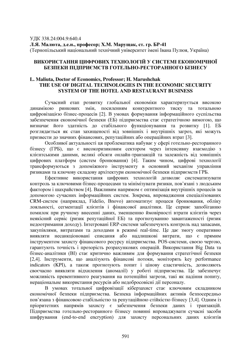 | Bibliographic citation (APA): | Maliuta, L., & Marushchak, H. (2025). Vykorystannia tsyfrovykh tekhnolohii u systemi ekonomichnoi bezpeky pidpryiemstv hotelno-restorannoho biznesu [The use of digital technologies in the economic security system of the hotel and restaurant business]. Proceedings of the ⅩⅣ International Scientific and Technical Conference of Young Scientists and Students “Current Issues of Modern Technologies”, 11-12 December 2025, Ternopil, 591-592. PE Palianytsia V.A.. [in Ukrainian]. |