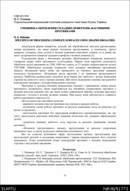 Bibliographic reference (2015): Галенда О. С. Специфіка оброблення складних поверхонь фасонними протяжками // Матеріали ⅩⅣ МНТКМУС „Актуальні задачі сучасних технологій“, Тернопіль, 11-12 грудня 2025. 2025. С. 71.