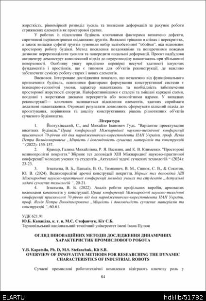 | Bibliographic citation (CHICAGO): | Kapatsila Y. B., Stefanchuk M. S., Kit S. B. (2025) Ohliad innovatsiinykh metodiv doslidzhennia dynamichnykh kharakterystyk promyslovoho robota [Overview of innovative methods for researching the dynamic characteristics of industrial robots]. Proceedings of the ⅩⅣ International Scientific and Technical Conference of Young Scientists and Students “Current Issues of Modern Technologies” (Tern., 11-12 December 2025), pp. 84-86 [in Ukrainian]. |