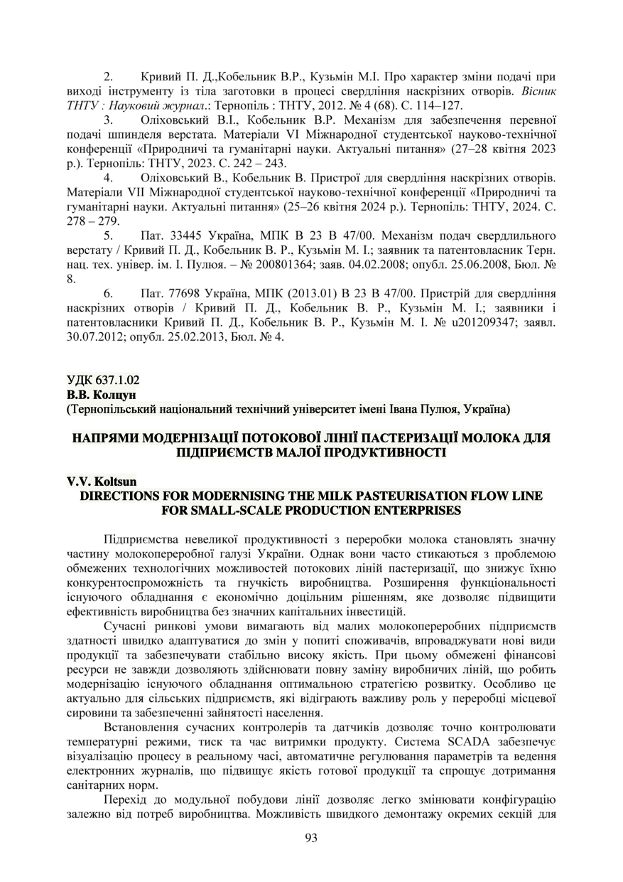 | Bibliographic citation (CHICAGO): | Koltsun V. V. (2025) Napriamy modernizatsii potokovoi linii pasteryzatsii moloka dlia pidpryiemstv maloi produktyvnosti [Directions for modernising the milk pasteurisation flow line for small-scale production enterprises]. Proceedings of the ⅩⅣ International Scientific and Technical Conference of Young Scientists and Students “Current Issues of Modern Technologies” (Tern., 11-12 December 2025), pp. 93-95 [in Ukrainian]. |