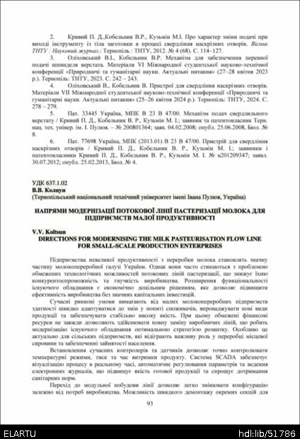 | Bibliographic reference (2015): | Колцун В. В. Напрями модернізації потокової лінії пастеризації молока для підприємств малої продуктивності // Матеріали ⅩⅣ МНТКМУС „Актуальні задачі сучасних технологій“, Тернопіль, 11-12 грудня 2025. 2025. С. 93–95. |