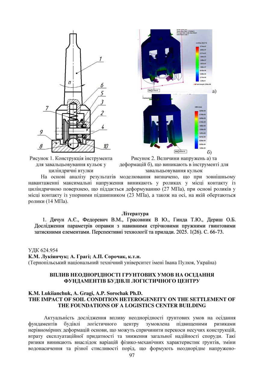 | Bibliographic citation (APA): | Lukiianchuk, K. M., Gragi, A., & Sorochak, A. P. (2025). Vplyv neodnoridnosti hruntovykh umov na osidannia fundamentiv budivli lohistychnoho tsentru [The impact of soil condition heterogeneity on the settlement of the foundations of a logistics center building]. Proceedings of the ⅩⅣ International Scientific and Technical Conference of Young Scientists and Students “Current Issues of Modern Technologies”, 11-12 December 2025, Ternopil, 97-98. PE Palianytsia V.A.. [in Ukrainian]. |