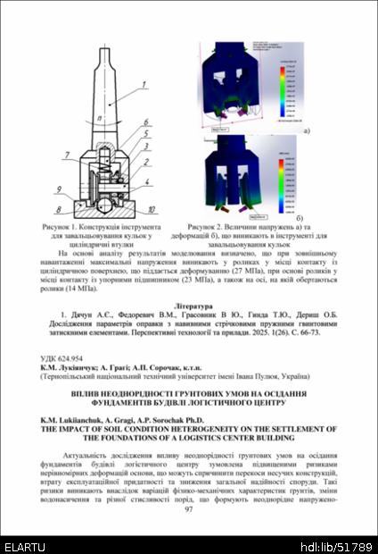 | Bibliographic citation (CHICAGO): | Lukiianchuk K. M., Gragi A., Sorochak A. P. (2025) Vplyv neodnoridnosti hruntovykh umov na osidannia fundamentiv budivli lohistychnoho tsentru [The impact of soil condition heterogeneity on the settlement of the foundations of a logistics center building]. Proceedings of the ⅩⅣ International Scientific and Technical Conference of Young Scientists and Students “Current Issues of Modern Technologies” (Tern., 11-12 December 2025), pp. 97-98 [in Ukrainian]. |