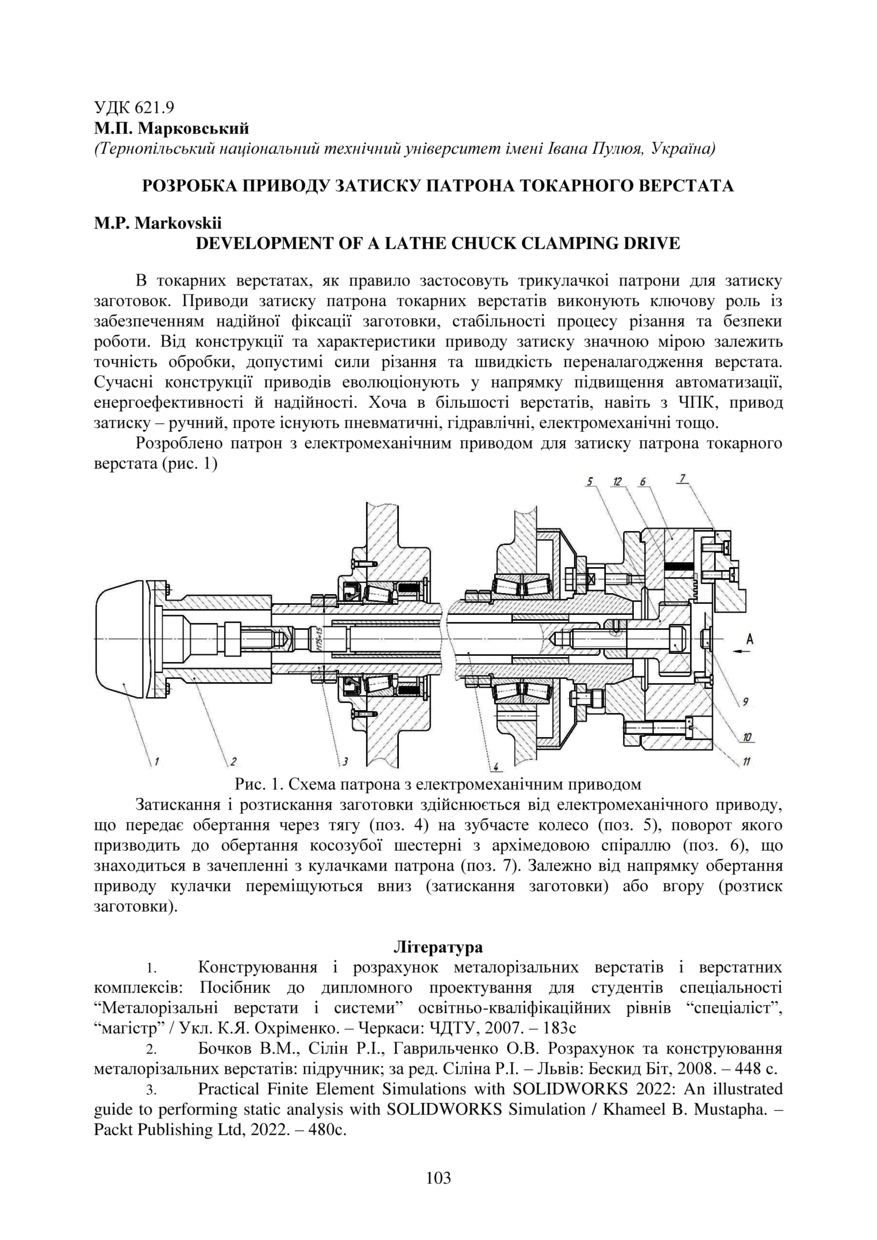 | Bibliographic citation (APA): | Markovskii, M. P. (2025). Rozrobka privodu zatisku patrona tokarnoho verstata [Development of a lathe chuck clamping drive]. Proceedings of the ⅩⅣ International Scientific and Technical Conference of Young Scientists and Students “Current Issues of Modern Technologies”, 11-12 December 2025, Ternopil, 103. PE Palianytsia V.A.. [in Ukrainian]. |