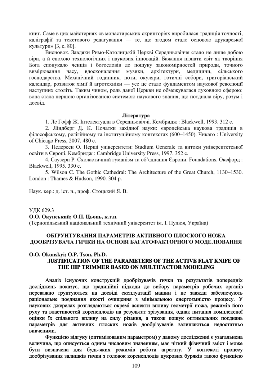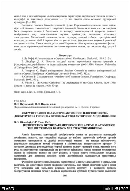 Bibliographic reference (2015): Окунський О. О., Цьонь О. П. Обґрунтування параметрів активного плоского ножа дообрізувача гички на основі багатофакторного моделювання // Матеріали ⅩⅣ МНТКМУС „Актуальні задачі сучасних технологій“, Тернопіль, 11-12 грудня 2025. 2025. С. 109–110.