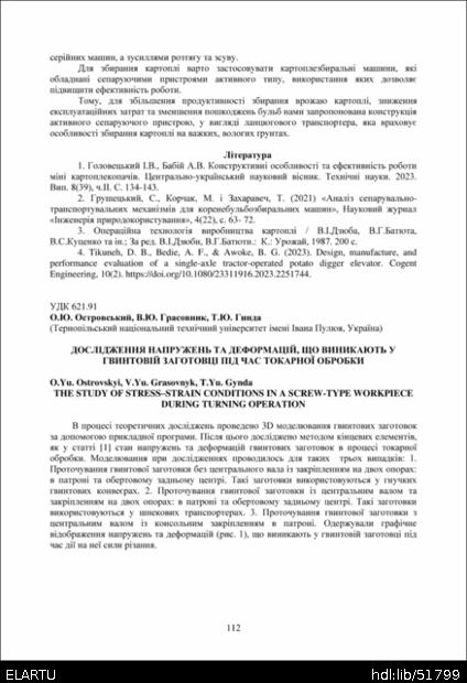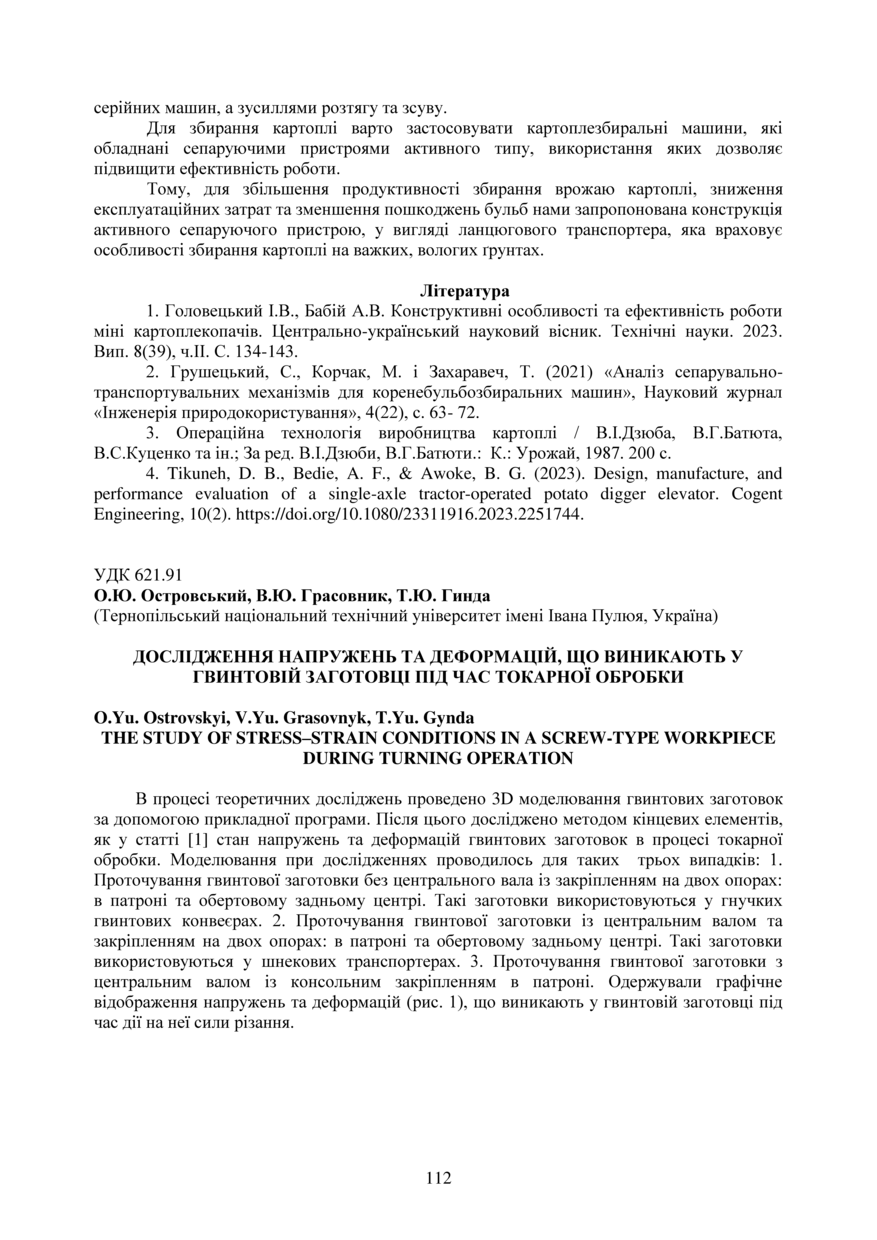 | Bibliographic reference (2015): | Островський О. Ю., Грасовник В. Ю., Гинда Т. Ю. Дослідження напружень та деформацій, що виникають у гвинтовій заготовці під час токарної обробки // Матеріали ⅩⅣ МНТКМУС „Актуальні задачі сучасних технологій“, Тернопіль, 11-12 грудня 2025. 2025. С. 112–113. |