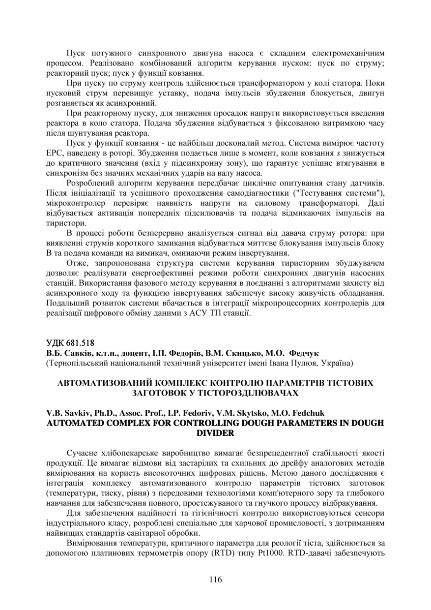 Bibliographic citation (APA): Savkiv, V. B., Fedoriv, I. P., Skytsko, V. M., & Fedchuk, M. O. (2025). Avtomatyzovanyi kompleks kontroliu parametriv tistovykh zahotovok u tistorozdiliuvachakh [Automated complex for controlling dough parameters in dough divider]. Proceedings of the ⅩⅣ International Scientific and Technical Conference of Young Scientists and Students “Current Issues of Modern Technologies”, 11-12 December 2025, Ternopil, 116-118. PE Palianytsia V.A.. [in Ukrainian].