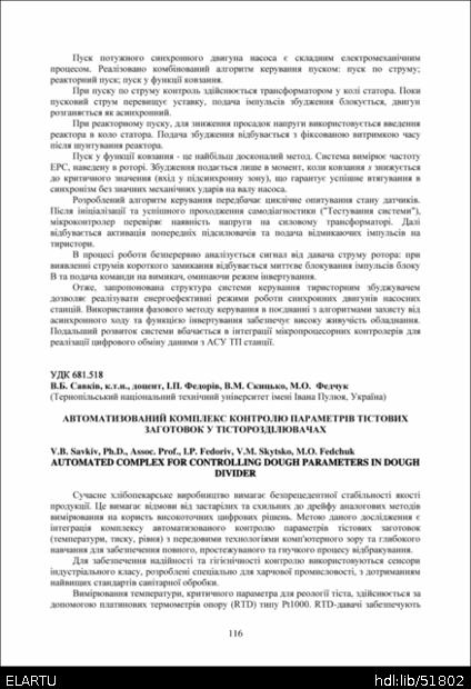 Bibliographic reference (2015): Автоматизований комплекс контролю параметрів тістових заготовок у тісторозділювачах / Савків В. Б. та ін. // Матеріали ⅩⅣ МНТКМУС „Актуальні задачі сучасних технологій“, Тернопіль, 11-12 грудня 2025. 2025. С. 116–118.