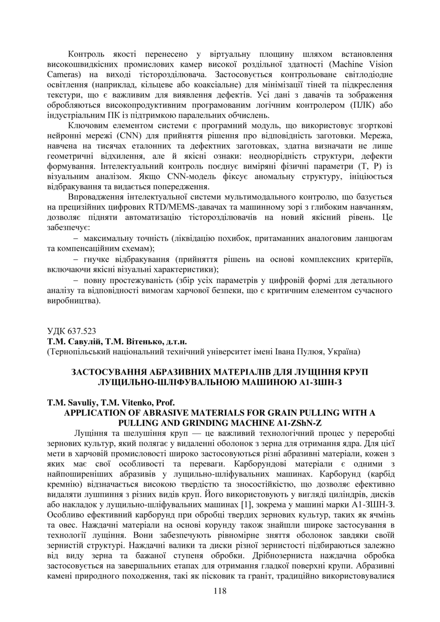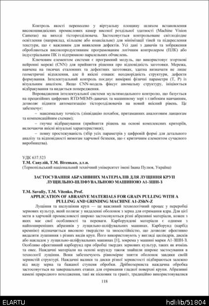 | Bibliographic citation (APA): | Savuliy, T. M., & Vitenko, T. M. (2025). Zastosuvannia abrazyvnykh materialiv dlia lushchinnia krup lushchylno-shlifuvalnoiu mashynoiu A1-ZShN-Z [Application of abrasive materials for grain pulling with a pulling and grinding machinE A1-ZShN-Z]. Proceedings of the ⅩⅣ International Scientific and Technical Conference of Young Scientists and Students “Current Issues of Modern Technologies”, 11-12 December 2025, Ternopil, 118-119. PE Palianytsia V.A.. [in Ukrainian]. |