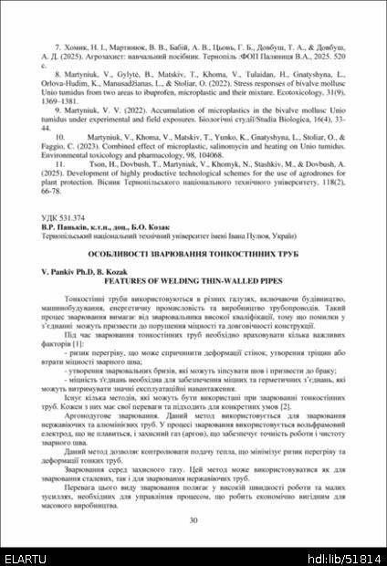 Bibliographic citation (APA): Pankiv, V., & Kozak, B. (2025). Osoblyvosti zvariuvannia tonkostinnykh trub [Features of welding thin-walled pipes]. Proceedings of the ⅩⅣ International Scientific and Technical Conference of Young Scientists and Students “Current Issues of Modern Technologies”, 11-12 December 2025, Ternopil, 30-32. PE Palianytsia V.A.. [in Ukrainian].