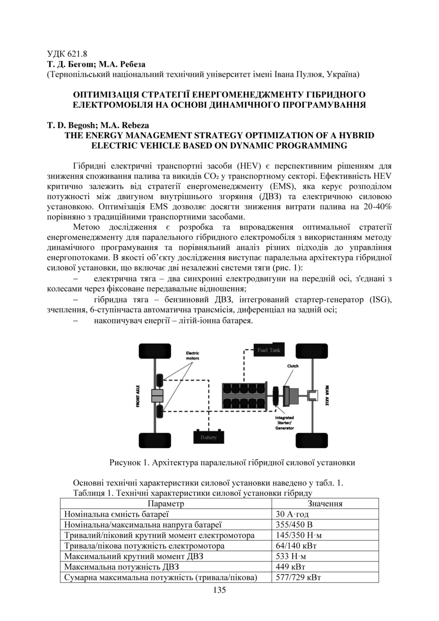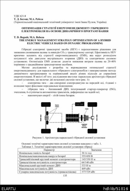 Bibliographic citation (CHICAGO): Begosh T. D., Rebeza M. A. (2025) Optymizatsiia stratehii enerhomenedzhmentu hibrydnoho elektromobilia na osnovi dynamichnoho prohramuvannia [The energy management strategy optimization of a hybrid electric vehicle based on dynamic programming]. Proceedings of the ⅩⅣ International Scientific and Technical Conference of Young Scientists and Students “Current Issues of Modern Technologies” (Tern., 11-12 December 2025), pp. 135-137 [in Ukrainian].