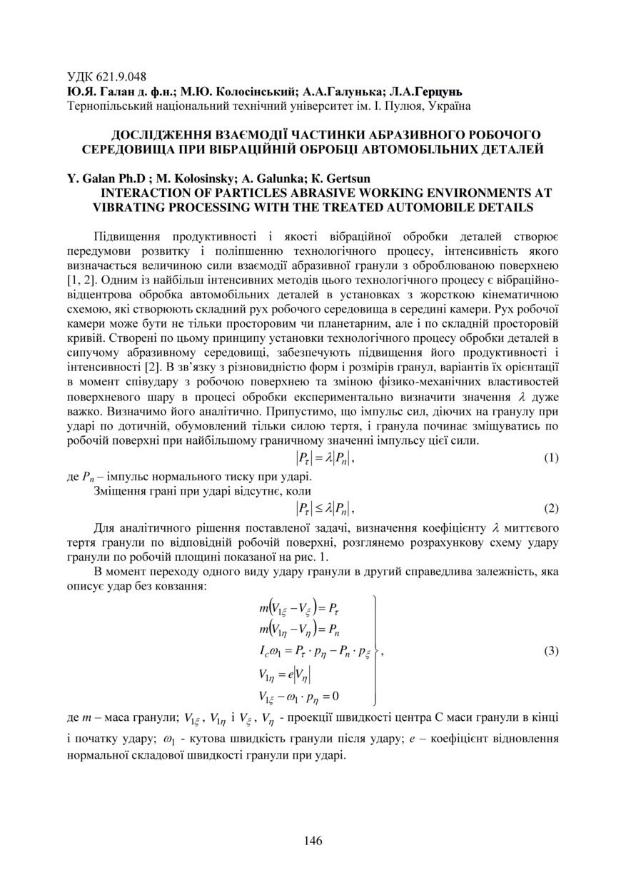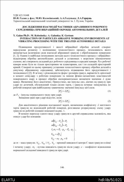 | Bibliographic citation (APA): | Galan, Y., Kolosinsky, M., Galunka, A., & Gertsun, L. (2025). Doslidzhennia vzaiemodii chastynky abrazyvnoho robochoho seredovyshcha pry vibratsiinii obrobtsi avtomobilnykh detalei [Interaction of particles abrasive working environments at vibrating processing with the treated automobile details]. Proceedings of the ⅩⅣ International Scientific and Technical Conference of Young Scientists and Students “Current Issues of Modern Technologies”, 11-12 December 2025, Ternopil, 146-148. PE Palianytsia V.A.. [in Ukrainian]. |