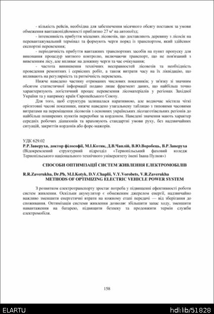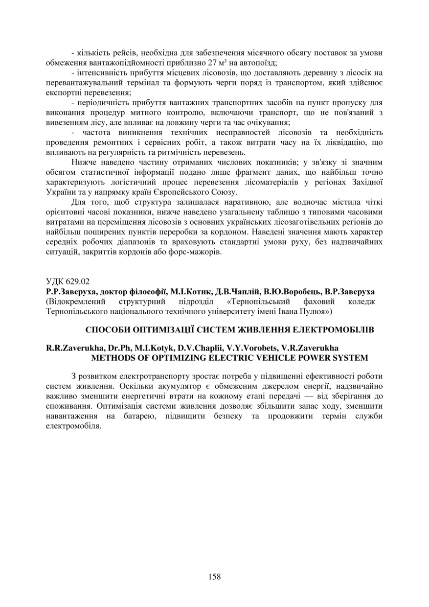 Bibliographic citation (CHICAGO): Zaverukha R. R., Kotyk M. I., Chaplii D. V., Vorobets V. Y., Zaverukha V. R. (2025) Sposoby optymizatsii system zhyvlennia elektromobiliv [Methods of optimizing electric vehicle power system]. Proceedings of the ⅩⅣ International Scientific and Technical Conference of Young Scientists and Students “Current Issues of Modern Technologies” (Tern., 11-12 December 2025), pp. 158-160 [in Ukrainian].