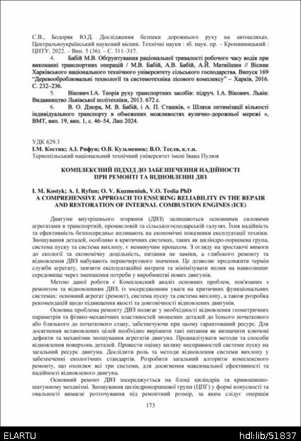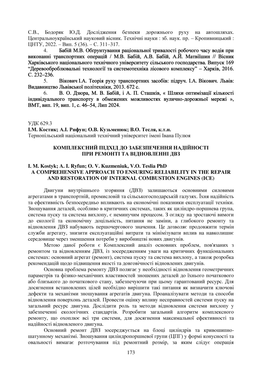 Bibliographic citation (APA): Kostyk, I. M., Ryfun, A. I., Kuzmeniuk, O. V., & Teslia, V. O. (2025). Kompleksnyi pidkhid do zabezpechennia nadiinosti pry remonti ta vidnovlenni DVZ [A comprehensive approach to ensuring reliability in the repair and restoration of internal combustion engines (ICE)]. Proceedings of the ⅩⅣ International Scientific and Technical Conference of Young Scientists and Students “Current Issues of Modern Technologies”, 11-12 December 2025, Ternopil, 173-175. PE Palianytsia V.A.. [in Ukrainian].