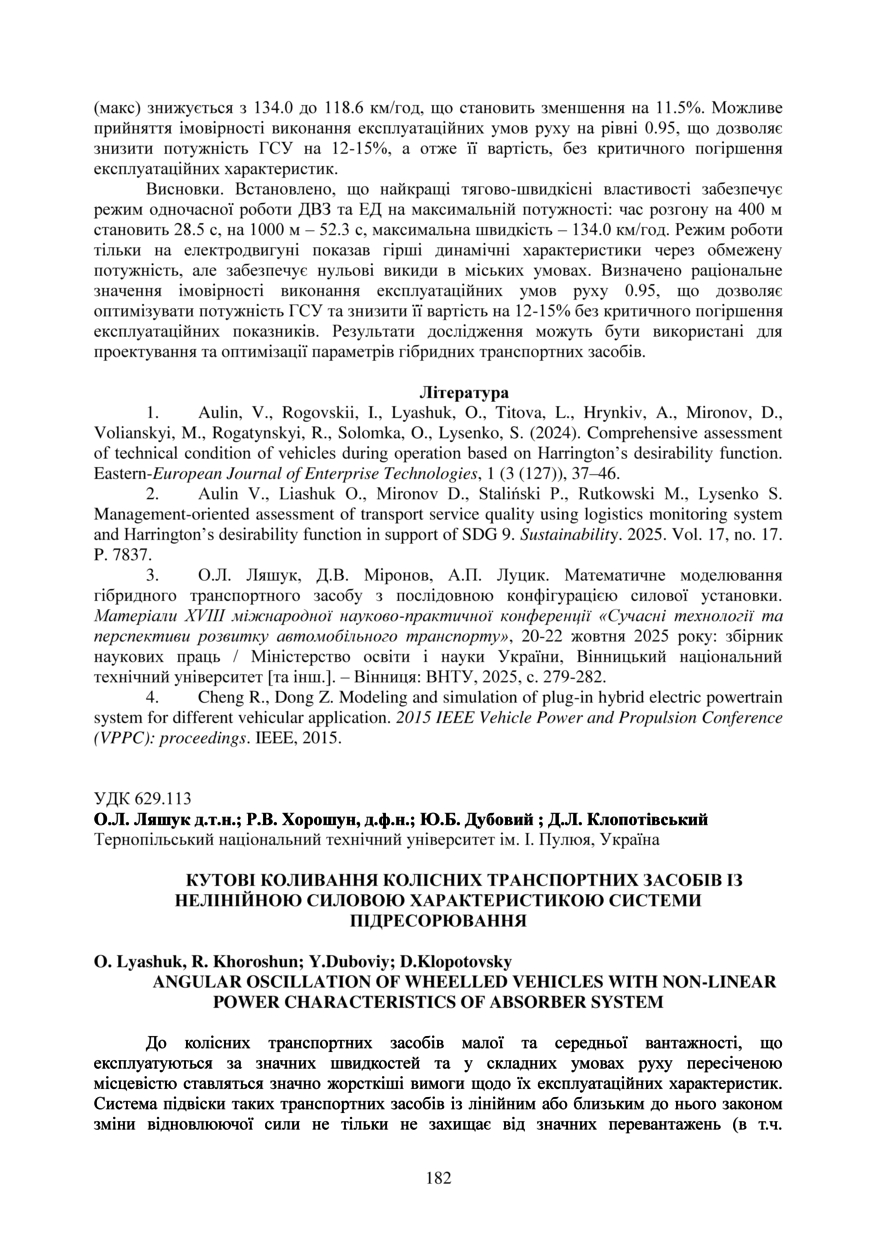 Bibliographic citation (CHICAGO): Lyashuk O., Khoroshun R., Duboviy Y., Klopotovsky D. (2025) Kutovi kolyvannia kolisnykh transportnykh zasobiv iz neliniinoiu sylovoiu kharakterystykoiu systemy pidresoriuvannia [Angular oscillation of wheelled vehicles with non-linear power characteristics of absorber system]. Proceedings of the ⅩⅣ International Scientific and Technical Conference of Young Scientists and Students “Current Issues of Modern Technologies” (Tern., 11-12 December 2025), pp. 182-184 [in Ukrainian].