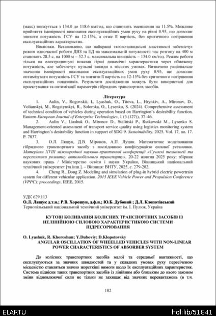 Бібліографічний опис: Кутові коливання колісних транспортних засобів із нелінійною силовою характеристикою системи підресорювання / Олег Леонтійович Ляшук, Роман Васильович Хорошун, Ю. Б. Дубовий, Д. Л. Клопотівський // Матеріали ⅩⅣ МНТКМУС „Актуальні задачі сучасних технологій“, 11-12 грудня 2025. — Т. : ФОП Паляниця В.А., 2025. — С. 182–184. — (Сучасні технології на транспорті).