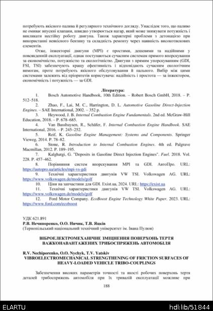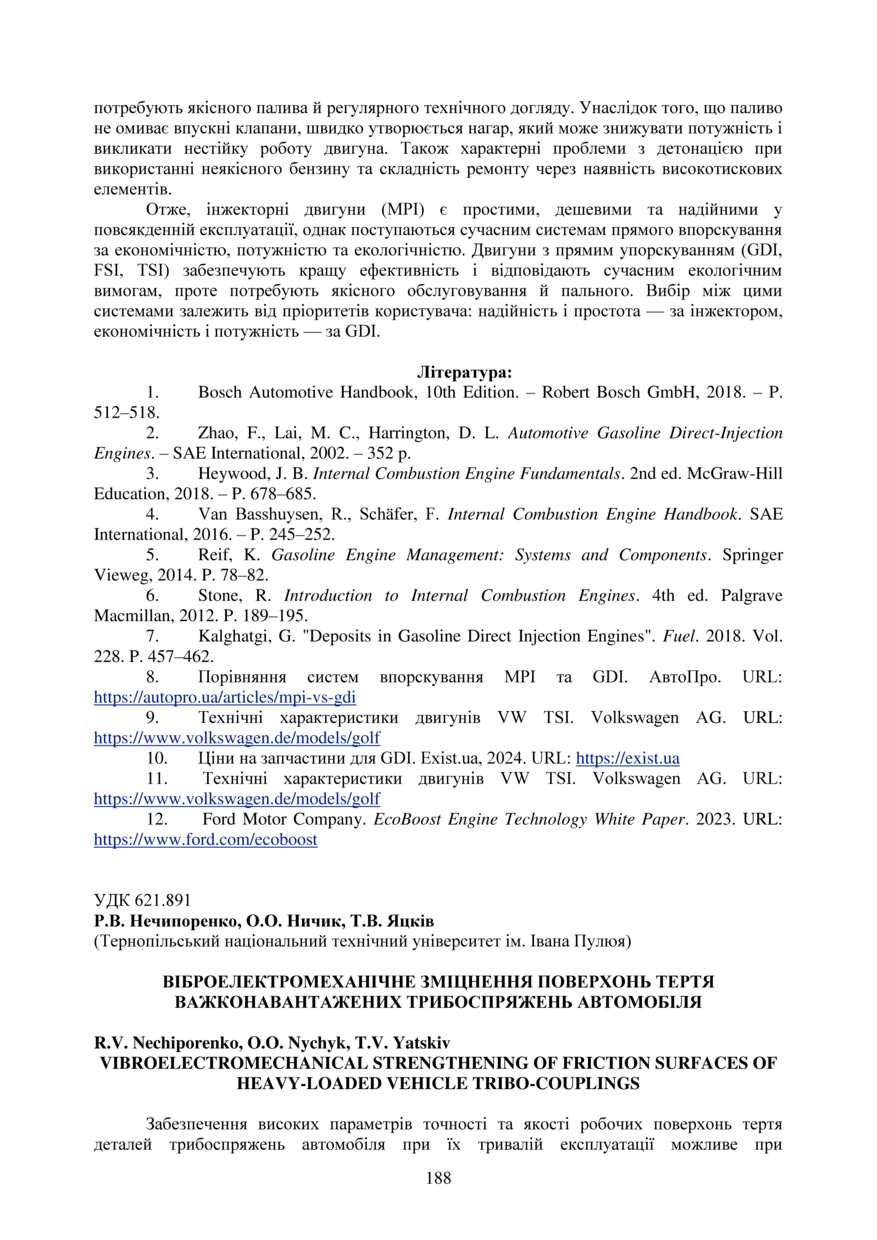 | Bibliographic citation (APA): | Nechiporenko, R. V., Nychyk, O. O., & Yatskiv, T. V. (2025). Vibroelektromekhanichne zmitsnennia poverkhon tertia vazhkonavantazhenykh trybospriazhen avtomobilia [Vibroelectromechanical strengthening of friction surfaces of heavy-loaded vehicle tribo-couplings]. Proceedings of the ⅩⅣ International Scientific and Technical Conference of Young Scientists and Students “Current Issues of Modern Technologies”, 11-12 December 2025, Ternopil, 188-190. PE Palianytsia V.A.. [in Ukrainian]. |