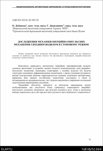 | Bibliographic citation (APA): | Dubynets, O., & Danylyshyn, G. (2004). Doslidzhennia mekhaniky inertsiino-impulsnykh mekhanizmiv z vkhidnym vodylom v stopovomu rezhymi [The study of inertial–pulsed mechanisms with input carrier mechanics in stop condition]. Scientific Journal of the Ternopil State Technical University, 9(4), 73-78. TSTU. [in Ukrainian]. |