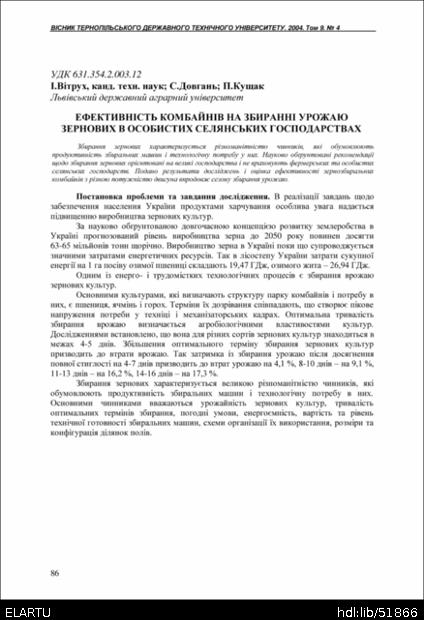 Bibliographic citation (APA): Vitrukh, I., Dovganʼ, S., & Kushak, P. (2004). Efektyvnist kombainiv na zbyranni urozhaiu zernovykh v osobystykh selianskykh hospodarstvakh [Combines efficiency of grain crops in individual farming]. Scientific Journal of the Ternopil State Technical University, 9(4), 86-91. TSTU. [in Ukrainian].