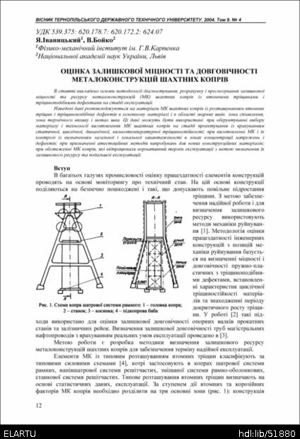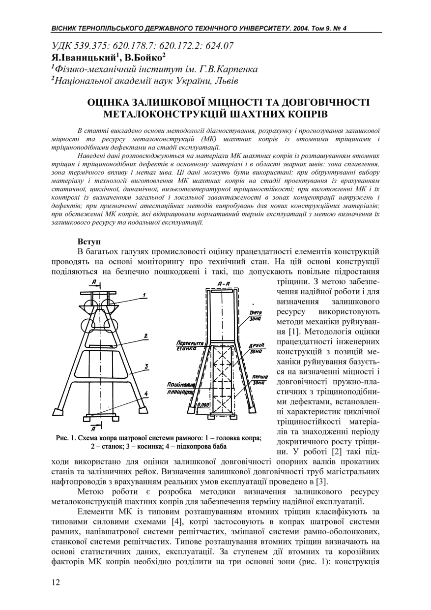 | Bibliographic citation (APA): | Ivanytskyi, Ya., & Boyko, V. (2004). Otsinka zalyshkovoi mitsnosti ta dovhovichnosti metalokonstruktsii shakhtnykh kopriv [Estimation of the remaining durability and service life of metal constructions of shaft headgear]. Scientific Journal of the Ternopil State Technical University, 9(4), 12-18. TSTU. [in Ukrainian]. |