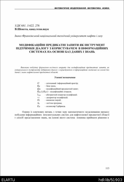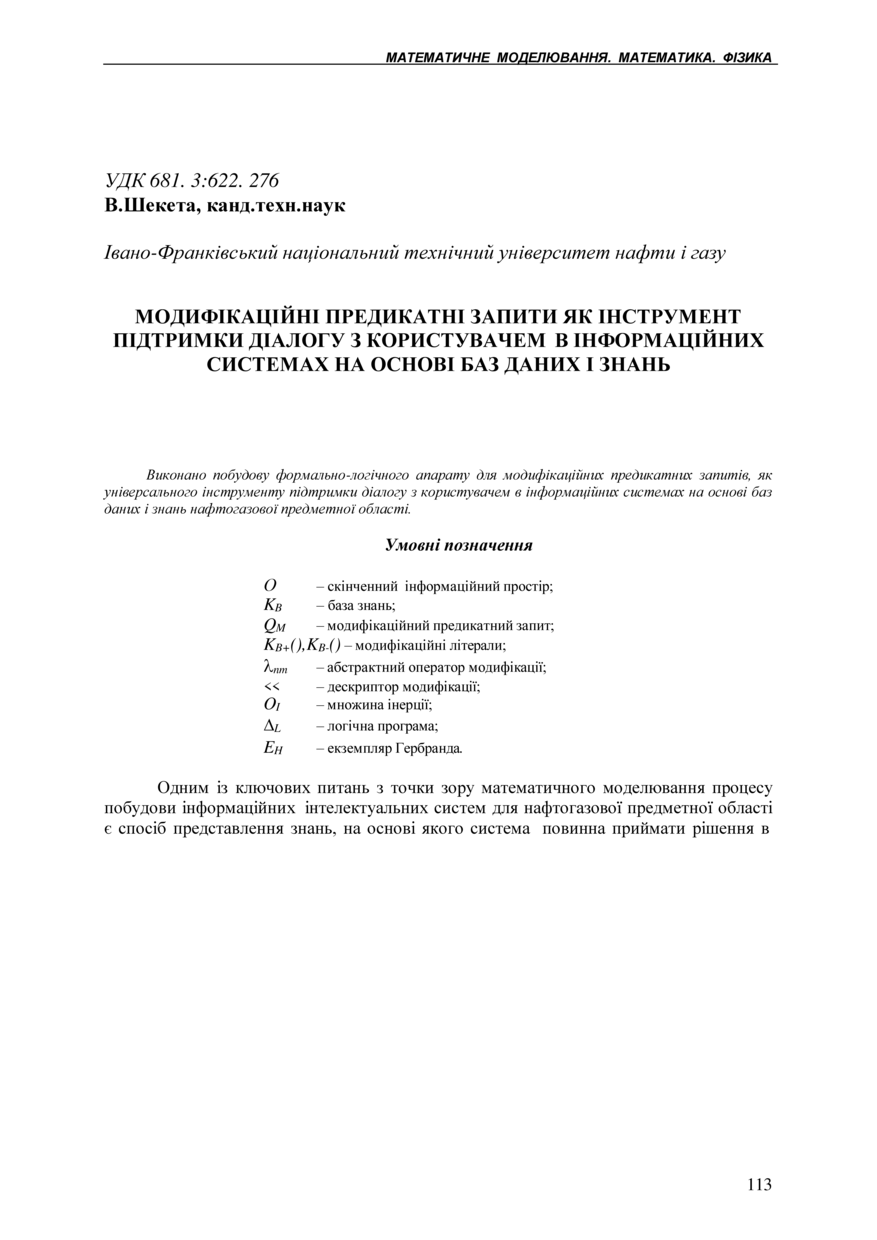 Bibliographic citation (CHICAGO): Sheketa V. (2003) Modyfikatsiini predykatni zapyty yak instrument pidtrymky dialohu z korystuvachem v informatsiinykh systemakh na osnovi baz danykh i znan [Predicate queries modifications, as a tool for supporting dialogs with an user in information systems on the basis of databases and knowledge bases of oil and gas subject domain]. Scientific Journal of the Ternopil State Technical University (Tern.), vol. 8, no 4, pp. 113-119 [in Ukrainian].